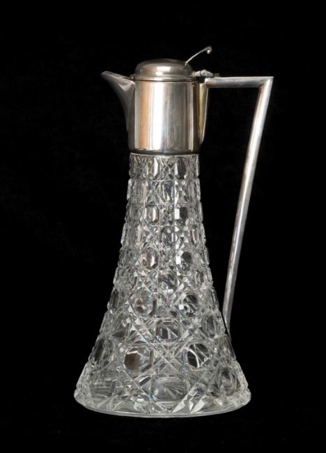 ROYAL BRIERLY CRYSTAL & SILVER MOUNTED CLARET JUG, London 1979, retailed through Harrods Ltd., angular handle, domed cover, hobnail cut flaring clear glass body, 28.8cms (h)Provenance: private collection CardiffComments: good overall