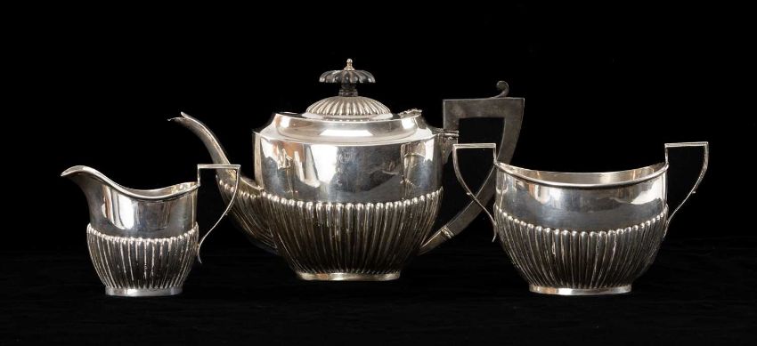 GEORGE V SILVER THREE-PIECE TEA SERVICE, Birmingham 1916, oval half fluted form, approx. wt. 13.5ozt (3)Provenance: private collectionComments: teapot spout bent, finial split