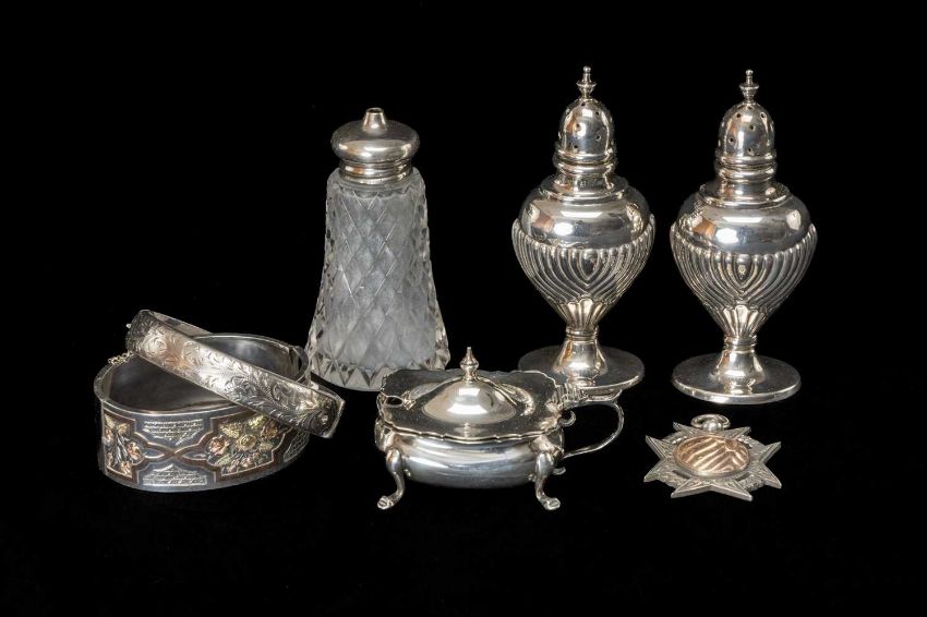 ASSORTED SILVERWARE including Victorian silver and gold-mounted Maltese cross watch fob 40mm (diam.), two hinged bracelets (one with applied gold accents), pair pepperettes, mustard and cut glass salt (7)Provenance: private collection GlamorganComments: one bracelet with damaged hinge