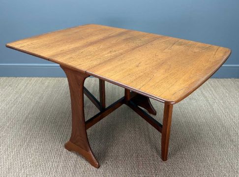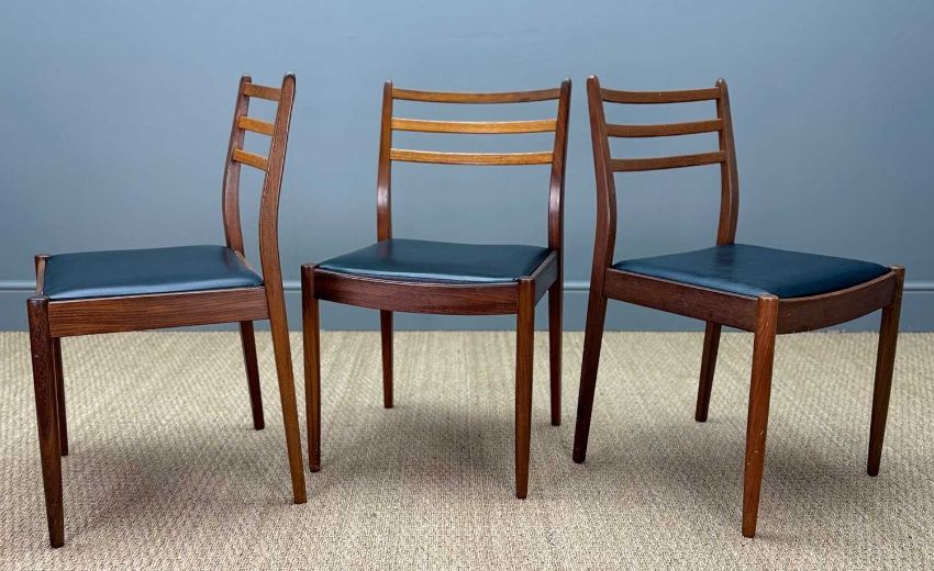 THREE G-PLAN FRESCO DINING CHAIRS, black faux-leather upholstered seats, 83 (h) x 43 (w), together with a G-Plan drop-leaf teak dining table, 73 (h) x 30.5 (w) (137cms extended)Provenance: consigned via West WalesComments: tear to seat upholstery, table top slight faded and general light scratches, one drop-leaf end slightly 'damp' stained, inspection advised