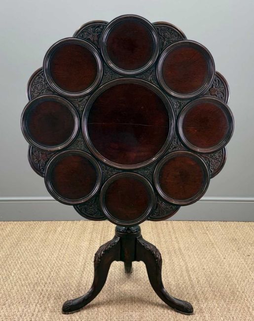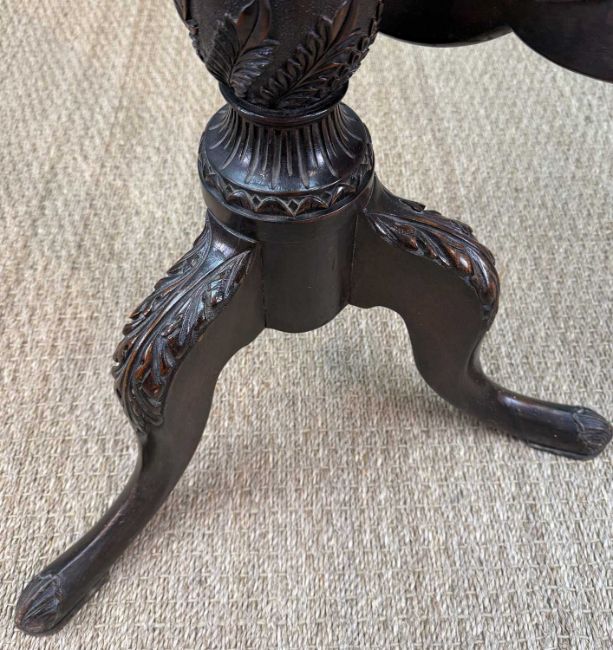 GEORGIAN STYLE MAHOGANY CARVED SUPPER TABLE, tilt-action top with large central moulded-edge dish surrounded by eight smaller, divided by foliate carved spandrels, spiral reed and vase column, acanthus leaf capped cabriole legs, pad feet, 73 (h) x 87cms (dia.)Provenance: private collection Vale of GlamorganComments: tilt-top support and upper column with considerable worm & catch damaged/loose as pictured, table top with central split, but overall good, inspection advised