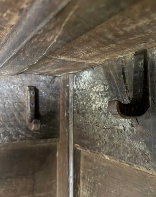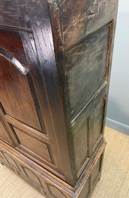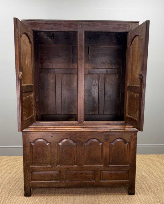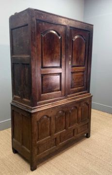 18TH C. WELSH JOINED OAK CLOTHES-HANGING PRESS CUPBOARD, later moulded cornice, fielded panel cupboard doors and base, 182 (h) x 123 (w) x 51cms (d) (dimensions as pictured without cornice)Provenance: private collection Vale of GlamorganComments: later mahogany cornice (loose/unfixed as photographed) with sample of original oak cornice included, general shrinkage splits, bumps and scratches, moulding losses, some blushing spots to base, later door pulls and escutcheon, interior alterations: basic nail hooks, two wooden pegs, one iron hook, no shelving, inspection advised