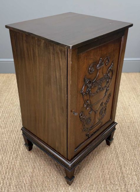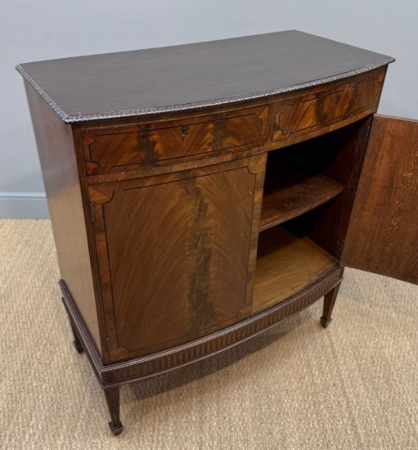 GROUP OF ANTIQUE FURNITURE comprising, 19th century ebony strung bowfront cabinet with two frieze drawers, 115 (h) x 101 (w) x 53cms (d), oak hinge-top commode box with two faux drawer fronts, 46 (h) x 49 (w) x 42cms (d), cabinet with moulded urn decoration, 83 (h) x 47 (w) x 43cms (d), mahogany cheval mirror, 163 (h) x 42cms (w) (4)Provenance: private collection Vale of GlamorganComments: commode top warped, all with general wear, bumps, veneer losses and scratches, inspection advised