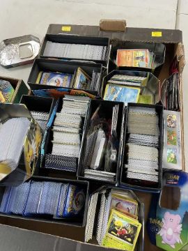 ASSORTED POKÉMON TRADING CARDS being a large quantity of various incomplete sets including Scarlet & Violet Base Set, fossil, Prismatic Evolutions, Fantasmal Flames, Surging Sparks, Destined Rivals plus earlier sets from the Sword and Shield era, Silver Tempest, Darkness Ablaze, Astral Radiance , Sun and Moon sets including Burning Shadows etc, together with Japanese cards, collectors tins and boxes, inspection advised (qty)Provenance: private collection CardiffComments: mostly common, some holos and reverse holos, not many, could not see any illustrations, base set cards in the folder all look play worn