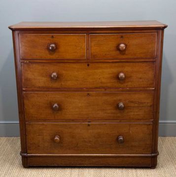 19TH CENTURY MAHOGANY CHEST, two short over three long, bottom drawer floor deep (incorporating plinth moulding), turned handles, 120 (h) x 119 (w) x 50cms (d)Provenance: private collection MonmouthshireComments: good colour, normal stains and light scratches, some veneer chips and losses, one handle damaged, lhs side with splits, inspection advised