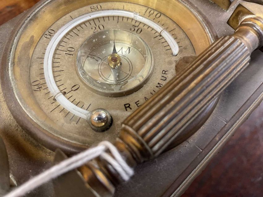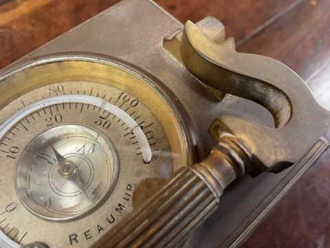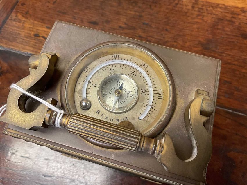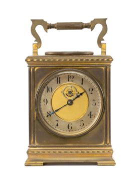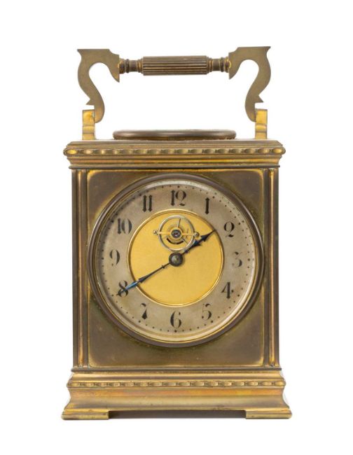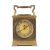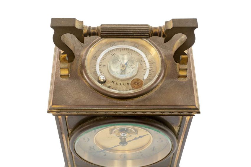 FRENCH GILT BRASS MANTEL CLOCK, in the form of a carriage timepiece, visible escapement, Arabic numerals to the chapter ring, the top with inset thermometer and compass, swing handle, 20cms (h) overallProvenance: private collection Vale of GlamorganComments: case gilding rubbed, thermometer broken
