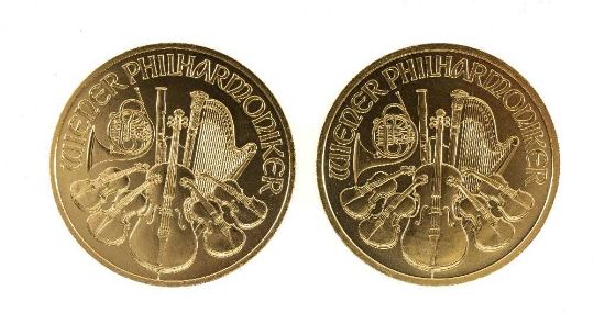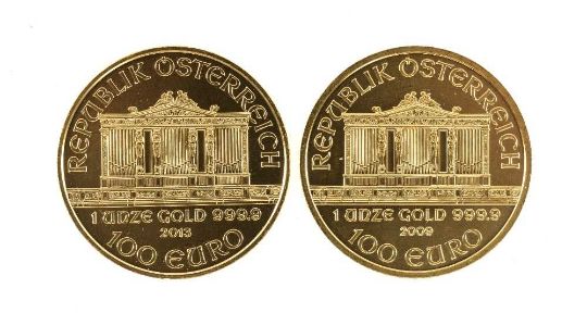 TWO AUSTRIAN PHILHARMONIC 100 EURO, 1oz fine gold coins, 2009 and 2013Provenance: deceased estate Gwynedd