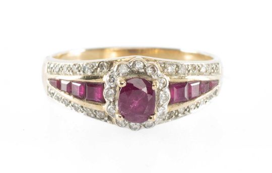 RUBY & DIAMOND CLUSTER RING in 9ct gold, set with an oval-cut ruby of approx. 0.25cts, flanked by tiny brilliants, the shoulders channel-set with graduated ruby baguettes and further tiny brilliants, size Q, 3.2gProvenance: private collection Cheshire