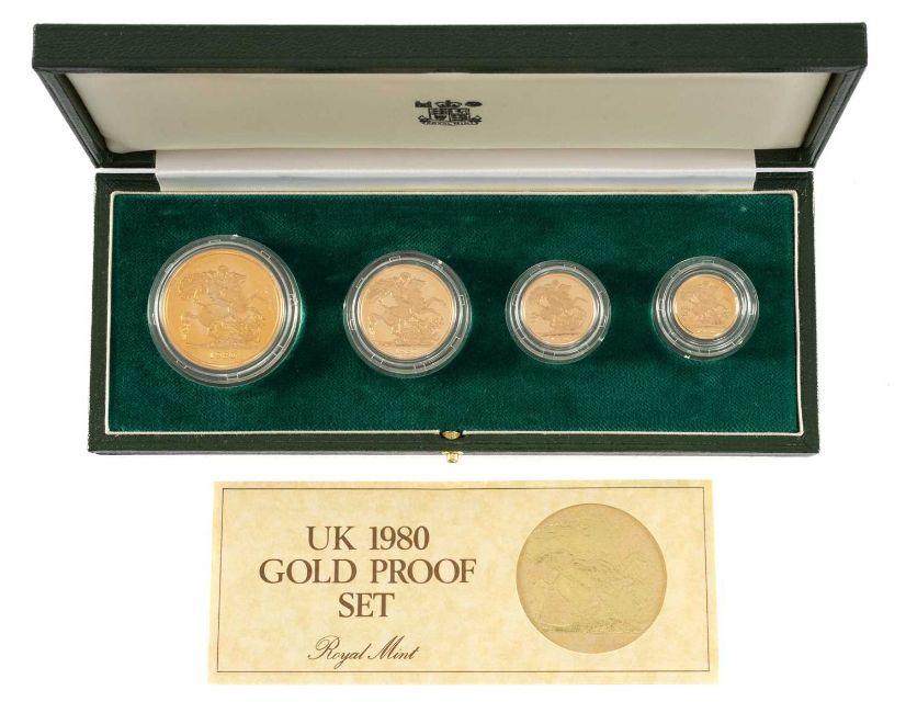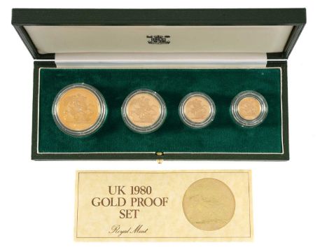 UNITED KINGDOM GOLD PROOF SET OF FOUR, 1980, £5, £2, sovereign, and half sovereign, gross weight 67.9g, boxed and with certificateProvenance: deceased estate Gwynedd