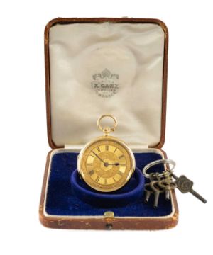VICTORIAN 18CT GOLD SWISS KEY-WIND FOB WATCH, Xavier Ganz, Swansea, London 1892, gold Arabic dial with three-colour gold foliate scroll border, foliate engraved centre, blued steel hands, movement signed and numbered 34699, 40mm (diam.), 56.0g, in retailers case of issue dated 1889-1910Provenance: private collection CardiffComments: excellent, not working at present, case hinge damaged.