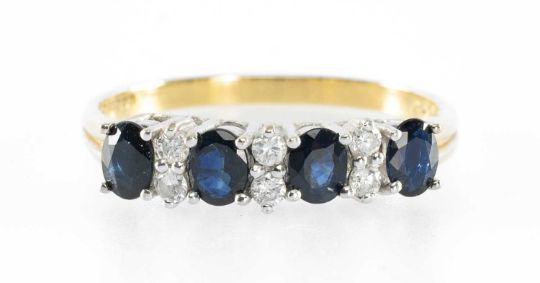 SAPPHIRE & DIAMOND CLUSTER RING in 18ct gold, set with four oval-cut sapphires dispersed with six tiny brilliants in 18ct white gold claw mounts on a yellow gold ring, size R, 3gProvenance: private collection Cheshire