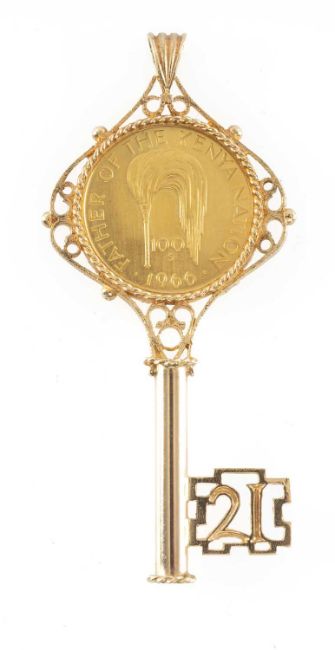 COMING OF AGE KEY FORM PENDANT in 9ct gold, centred with a Kenyan Mzee Jomo Kenyatta, Father of the Kenya Nation 100 shilling gold coin, 1966, 65mms (l), 13.9gProvenance: deceased estate Wirral