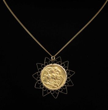 SOVEREIGN PENDANT NECKLACE, George V sovereign, 1912, within a 9ct gold star-form pendant mount, suspended from an 18ct fine curb-link necklace, 65.5cms (l), chain 4.1g, pendant gross weight 10.5gProvenance: deceased estate Wirral