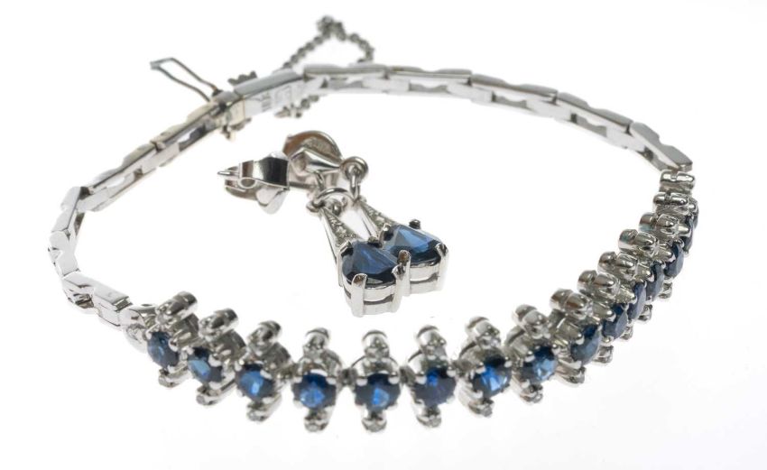 18CT WHITE GOLD SAPPHIRE & DIAMOND BRACELET, set with round cut sapphires flanked with tiny diamonds, on an open link bracelet with safety chain, approx. 16.5cms (l), 10.4g; together with a pair of sapphire and diamond pendant earrings in 18ct white gold, with pear cut sapphires, each approx. 0.5cts, 25mms drop, 3.4g (3)Provenance: private collection FlintshireComments: some links stiff/fused, clasp stamped 18k