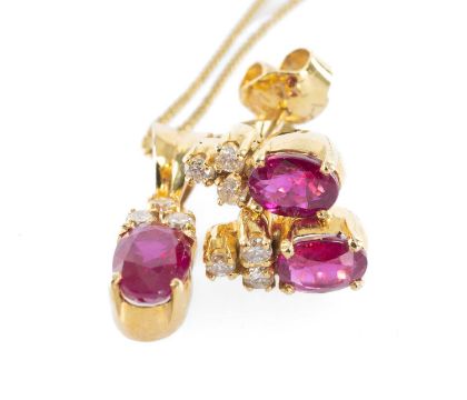 RUBY & DIAMOND PARURE, ruby & brilliant-cut diamond pendant set in 18ct yellow gold, 18mm drop, pair matching ear studs all set in 18ct yellow gold, gross weight 3.85g, with gilt fine curb choker necklace (4)Provenance: private collection Cheshire