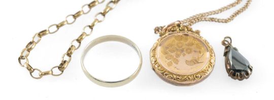 9CT WHITE GOLD WEDDING RING, size S, 1.6g; a length of 9ct gold chain, 2.7g; an obsidian pear shaped pendant set in metal, 15mms; and a 9ct gold front and back engraved circular picture locket, 21mms (diam.), suspended from a gold-plated chain necklace (4)Provenance: private collection Ynys Môn